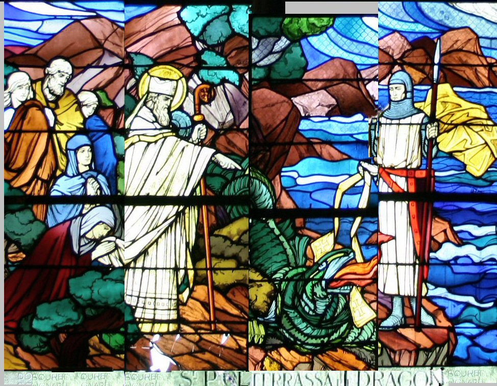 Arthur says triumphantly, “Ah, but I have come today with something more powerful than this ancient spell of Nimue. It is a dragon's tooth that my cousin, St. Paul Aurelianus5.6 pulled from the great dragon's mouth on the Isle of Batz in Brittany. As he intoned a prayer to the Creator, a sharp tooth had caught on his embroidered priestly stole while he leashed it and forced it into the sea.”