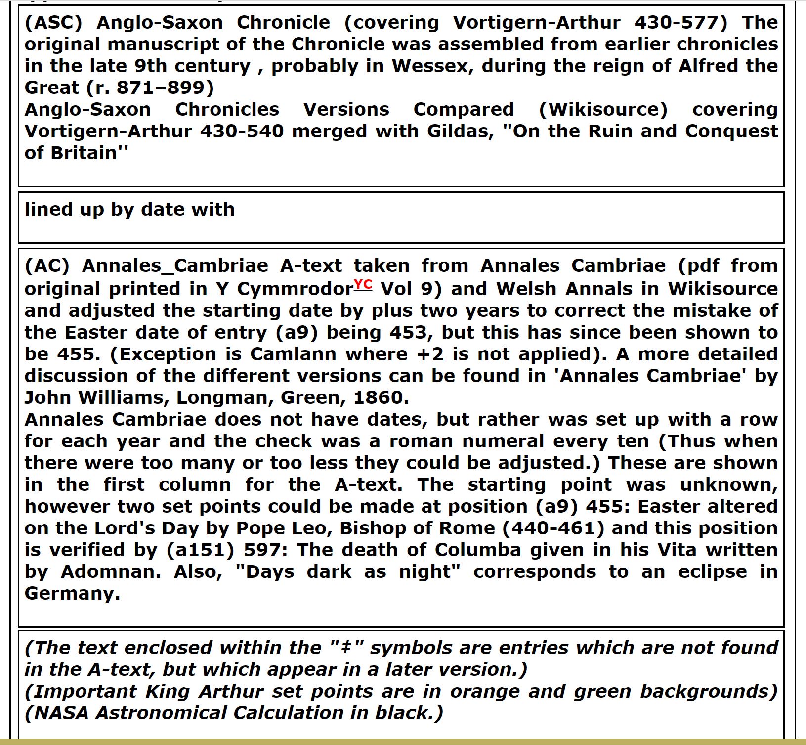 The footnotes shown in red are essential to support the telling of this most truthful story of Arthur. Although shown in the hardcover book they are neither linked nor included to avoid the high costs of color printing in order to reduce the per-book cost. In this ebook the story and the references are shown. You will find the footnotes that relate to each chapter organized by chapter and number and after that: the fuller background references. The more universal footnotes are shown at the end with letters such as: (ASC) Anglo-Saxon Chronicle, (AC) Annales_Cambriae, (NEN) Nennius - Historia Brittonum, (GIL) Gildas-Ruin and Conquest of Britain, (GM) Geoffrey of Monmouth The History of the Kings of Britain (an imaginary mishmash to be avoided), (MAB) The_Mabinogion: (CO) Culhwch and Olwen, or The Twrch Trwyth, (DR) & The Dream of Rhonabwy & (LL) The Story of Lludd and Llevelys, (SG) Stanzas of the Grave, (TRI) Triads, (LBS) Lives of the British Saints, (BBC) - The Black Book of Carmarthen, and others.