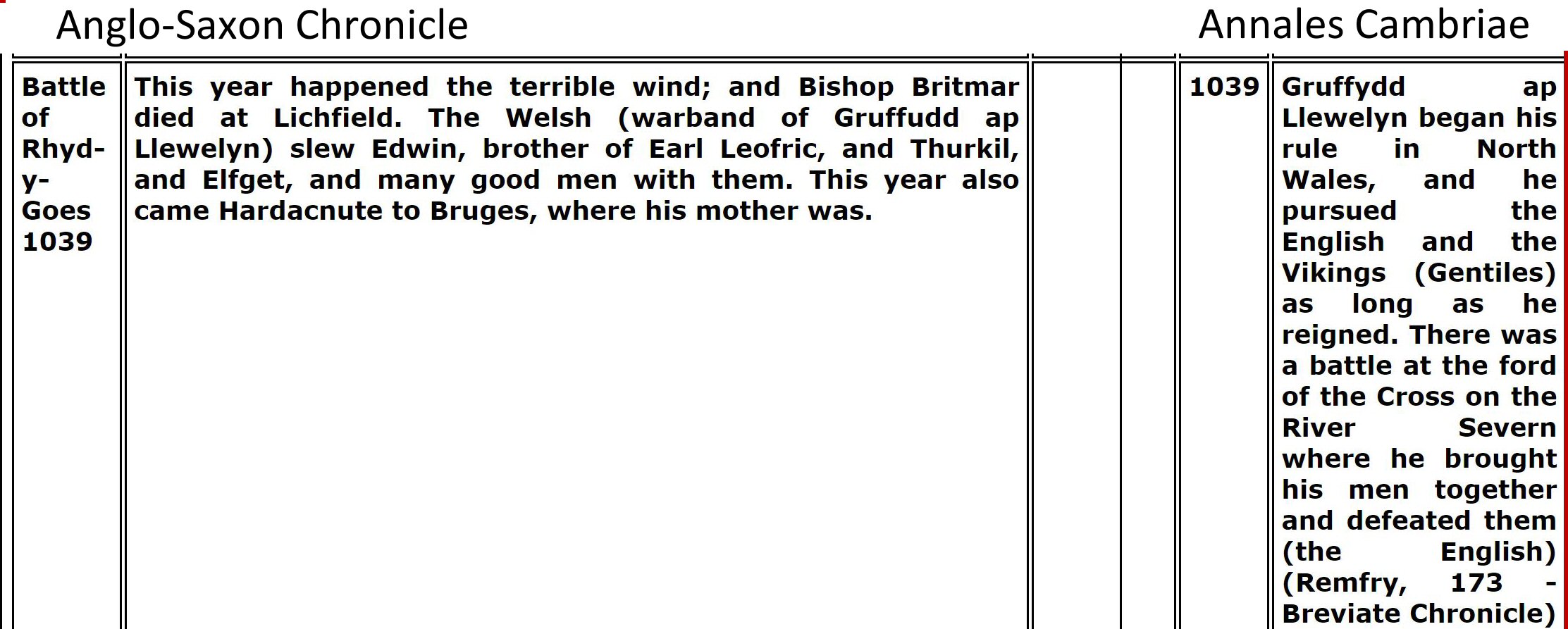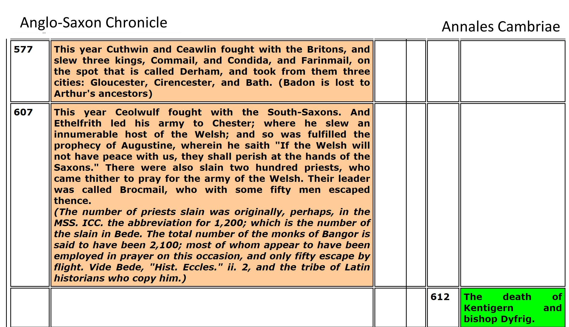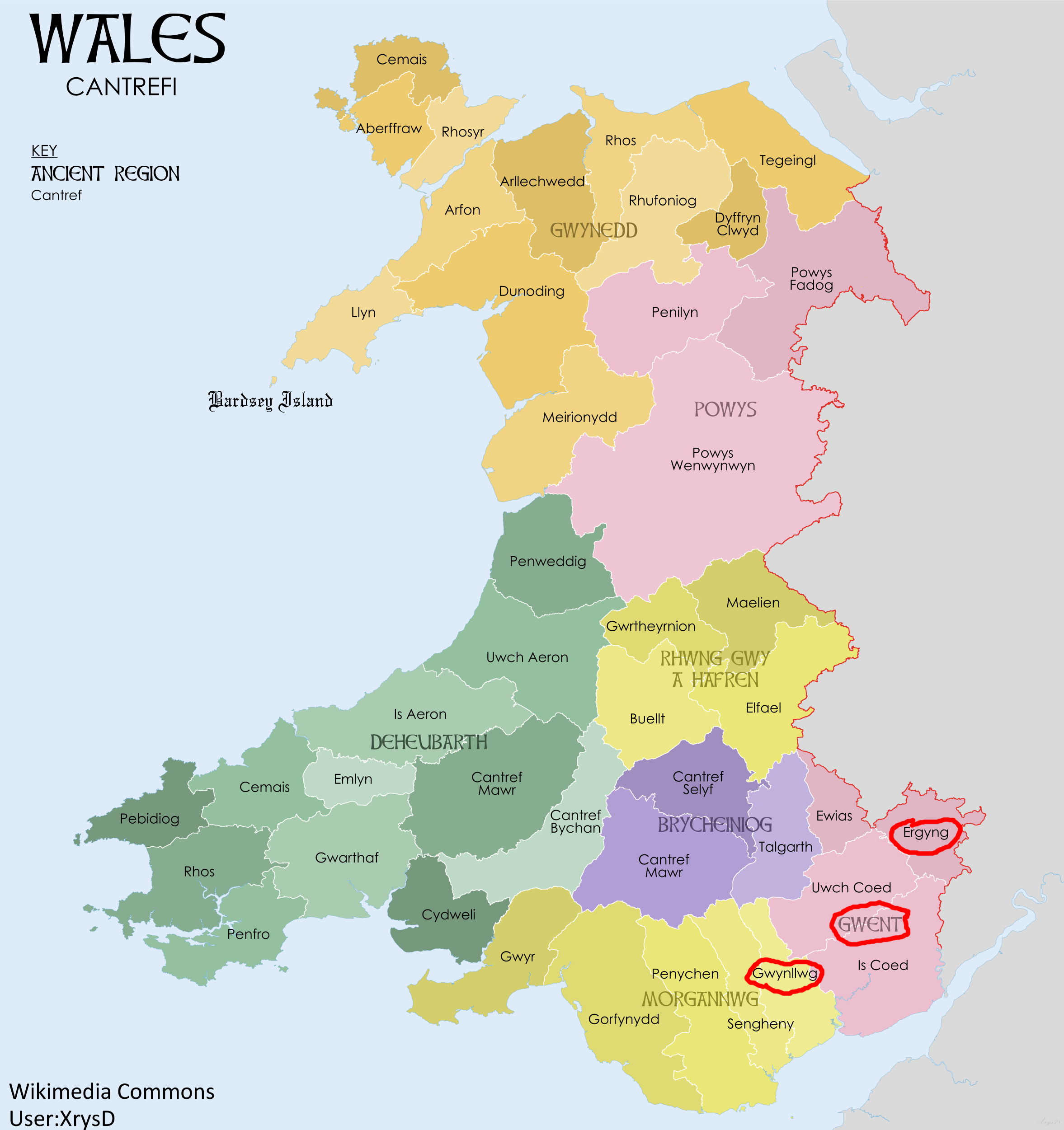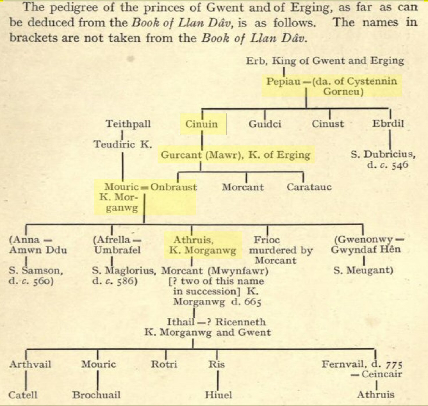 "Ergyng was a small but rich kingdom on the borders of Wales and England around Hereford, know better by the name Archenfeld. Medrawd ap Caurdaf ap Caradoc Vreichfas ap Gwrgan Mawr ap Cynfyn ap Pebiau Claforawg (the Dribbler) who married the daughter of King Cystennyn and was the grandfather of Dubricius from his daughter Yrddil."