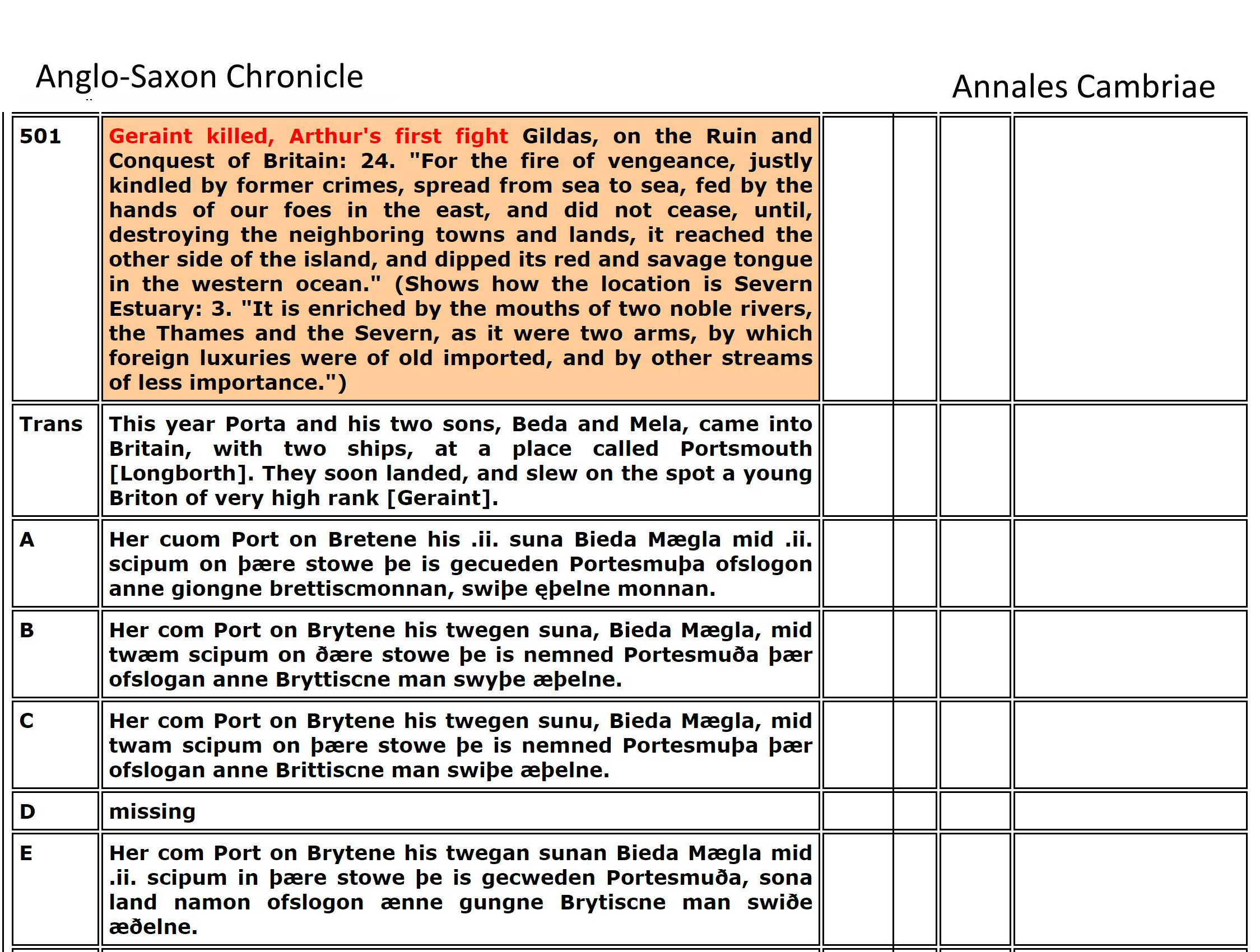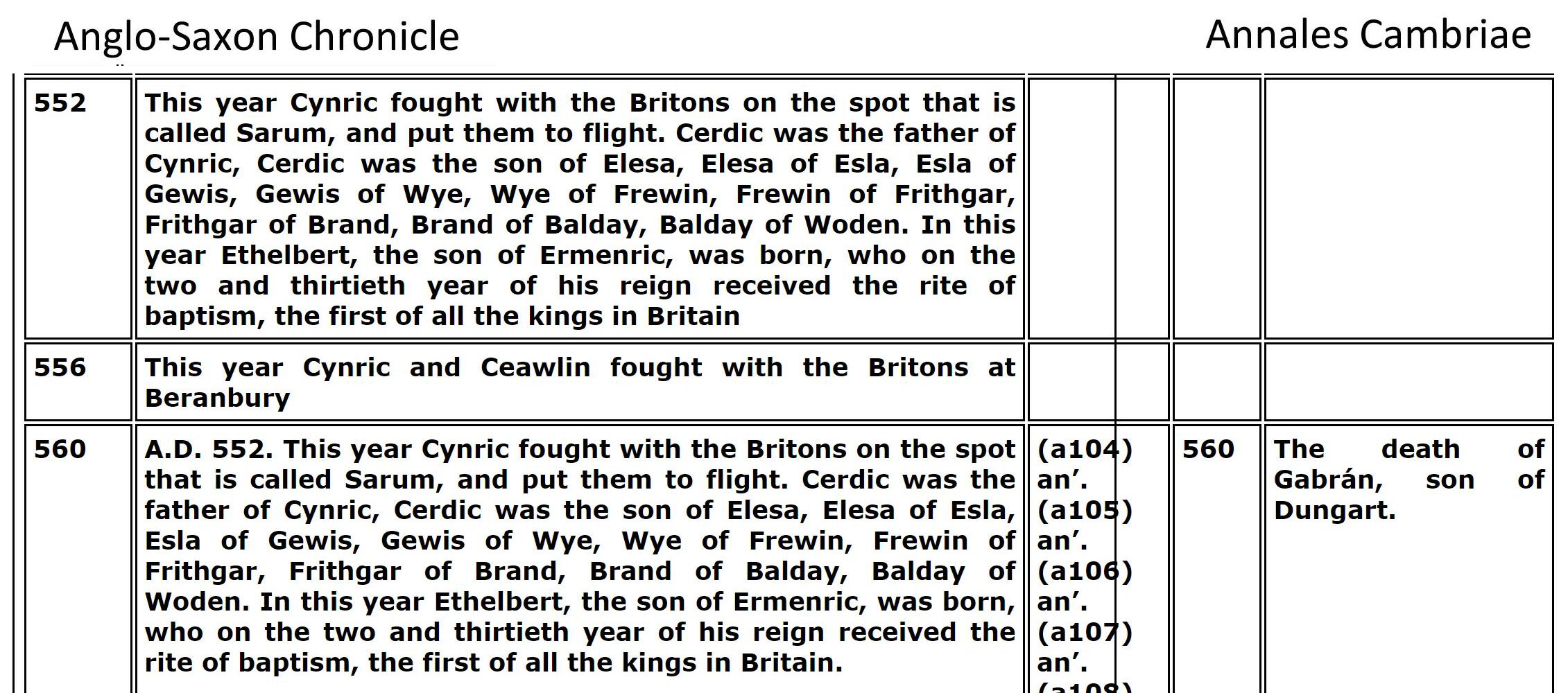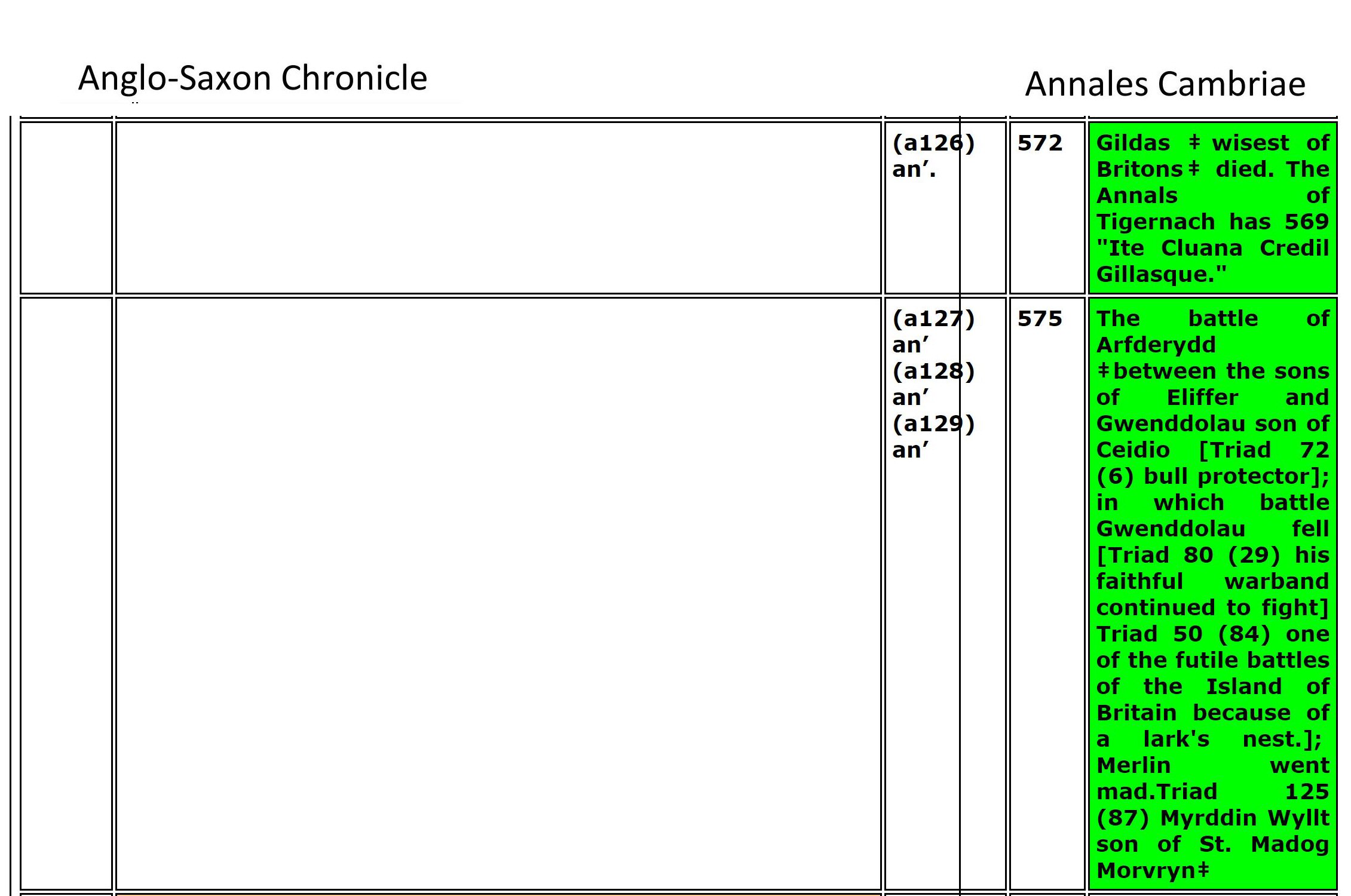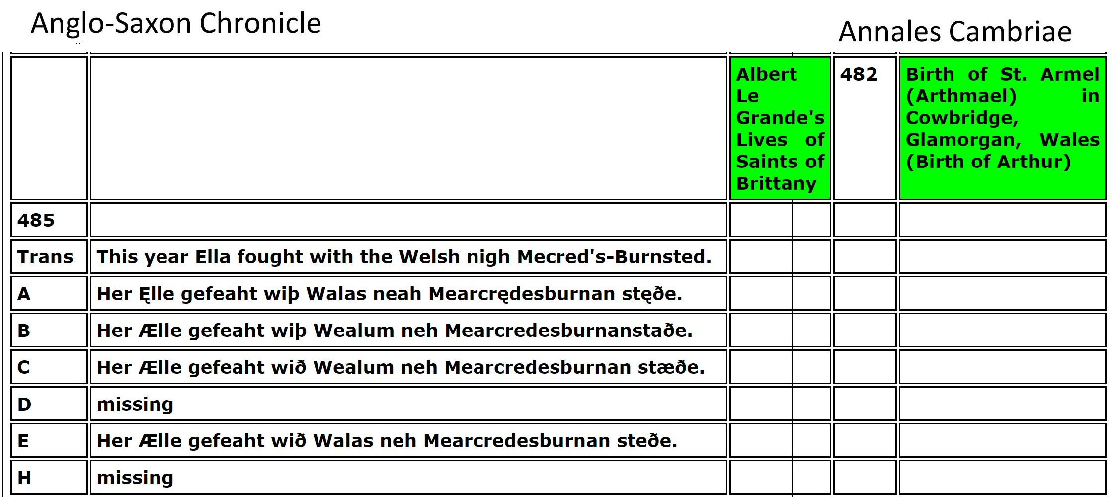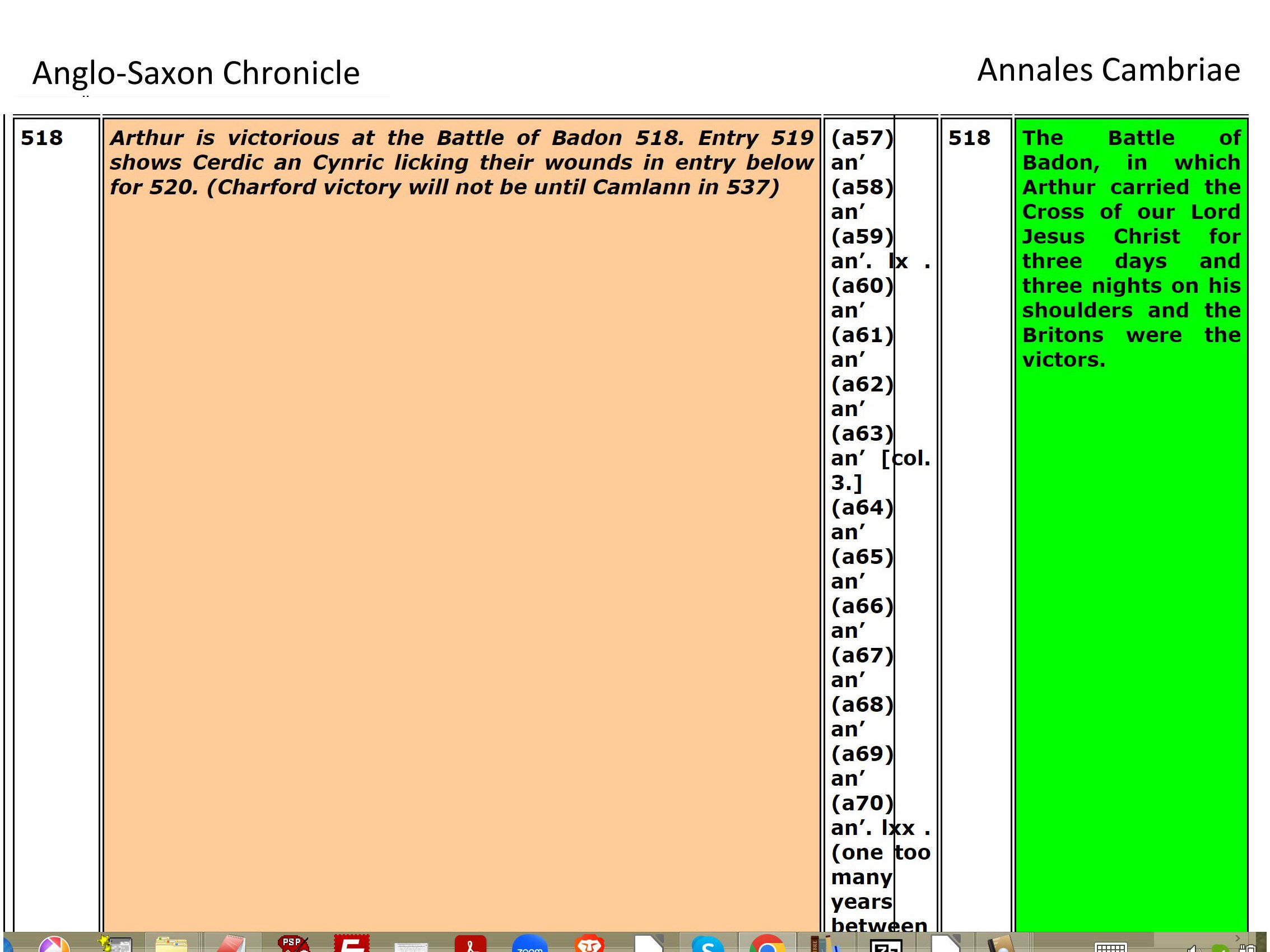 The researchers spend their time digging in Tintagel Castle (built in the 1230s!) and search for clues from Geoffrey of Monmouth's fabricated story. Instead, I found Arthur documented in the Llandaff Charters as the King of Gwent in Wales, studying with the famous Celtic Christian Saints of Wales. Using genealogy I found his descent from Magnus Maximus and Constantine the Blessed, both Emperors of the Western Roman Empire, which made him well-suited to fight against the encroachments of the Saxons and Gewissei. I found many other details in the Anglo-Saxon ChroniclesASC aligned with Annales CambriaeAC, Nennius' (Historia Brittonum)NEN, Lives of the British SaintsLBS, Llandaff ChartersBL, the MabinogionMAB, the TriadsTRI, and joined genealogies of Arthur from Constantine the BlessedA6 including his sister's husbands of Emyr LydawA7.