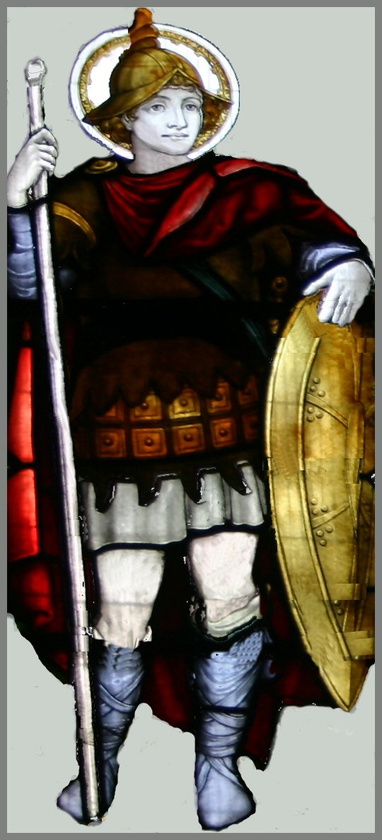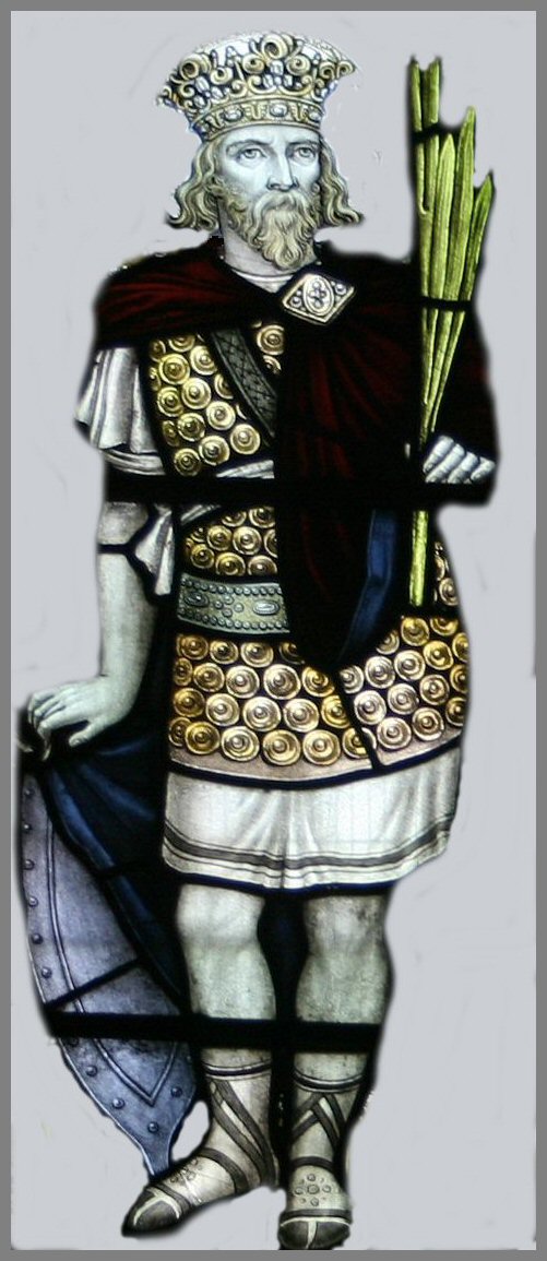“For a few minutes, Arthur and Merlyn stare at each other in disbelief, then Arthur rushes through the doorway. As he does so, his saint’s clothes become a red tunic; and instead of his shaved tonsure, he becomes that young Arthur at age 19. He had curly brown hair, a gold helmet, and blue boots, and now being completed with a halo for his years as a Saint who aided Geraint, the nephew of my great great grand uncle Ambrosius at the Battle of Longborth7.3.”