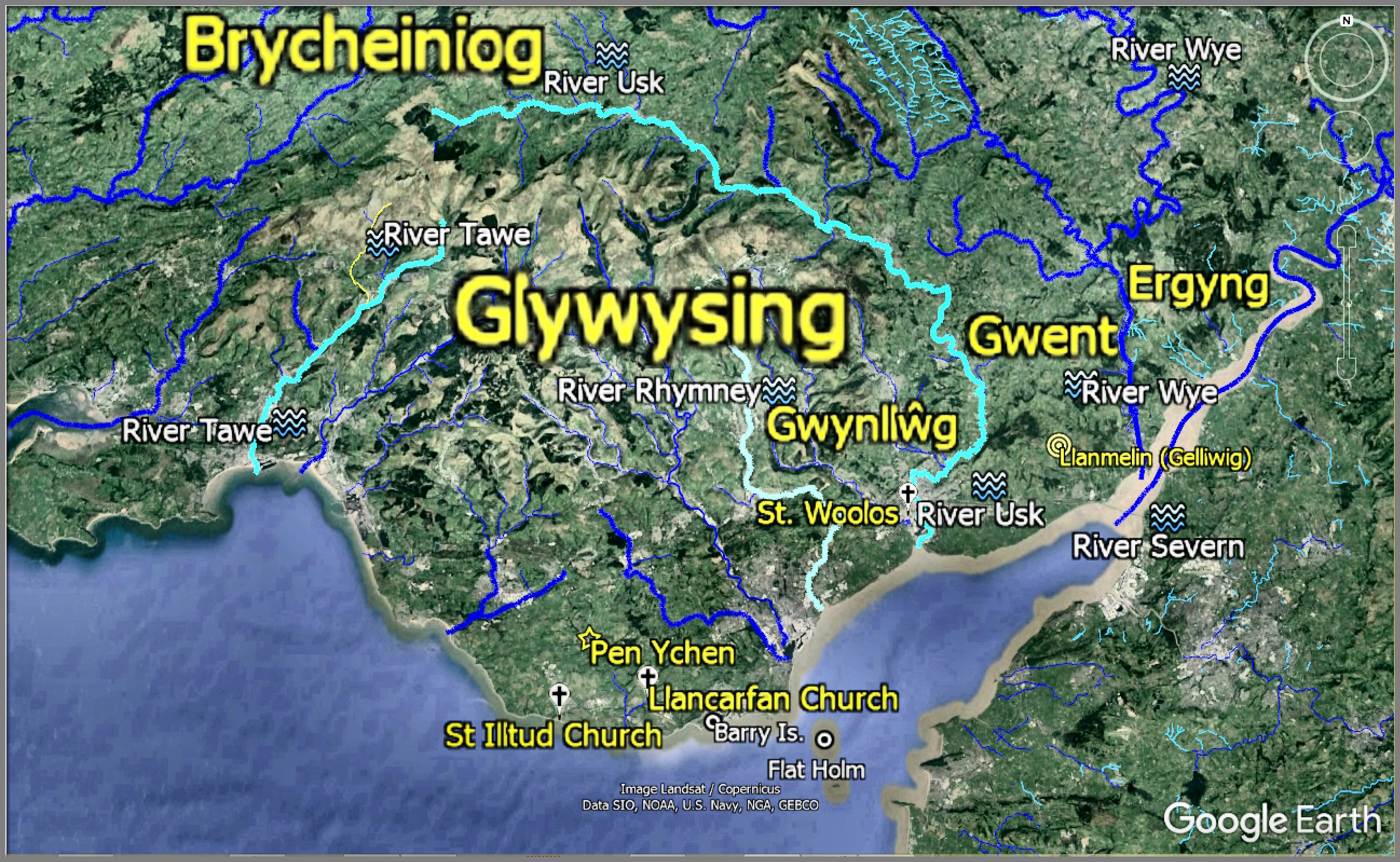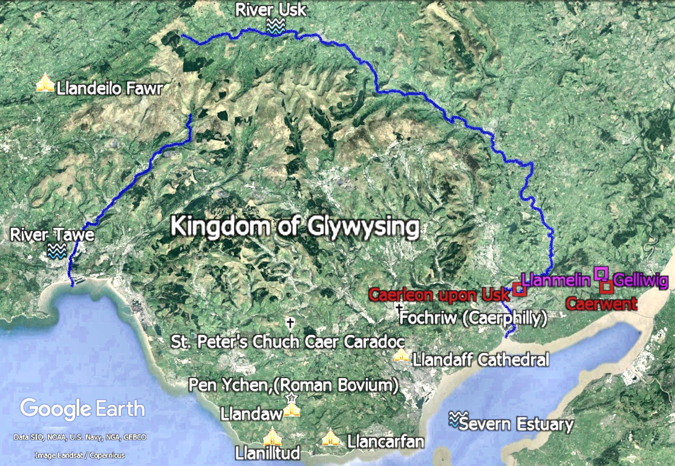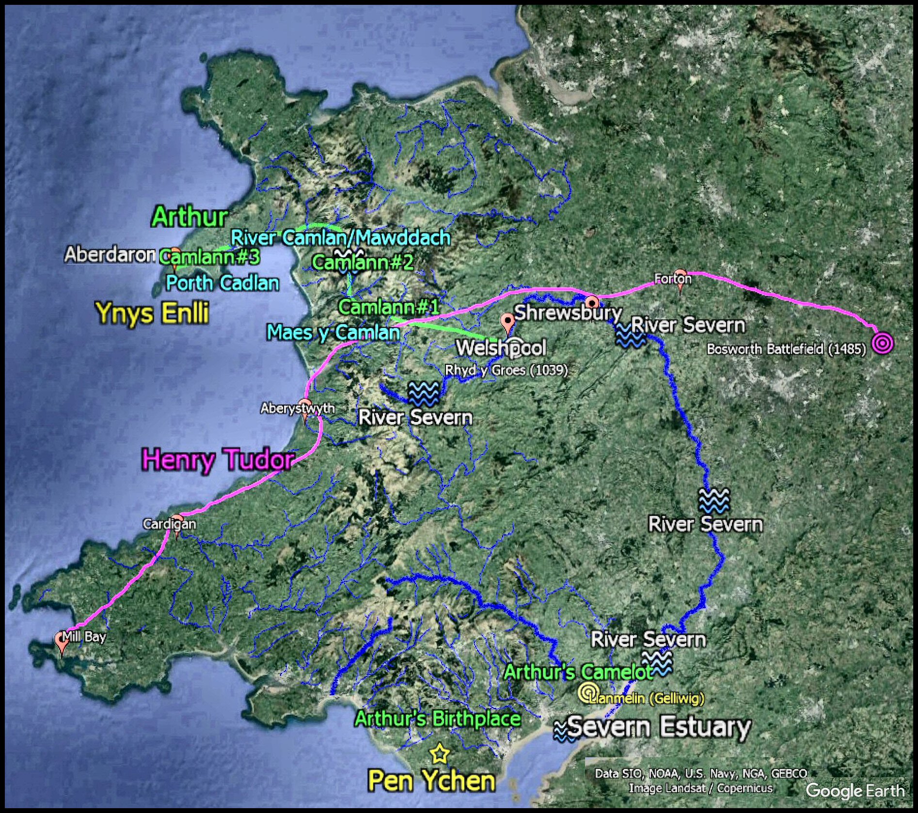 When Henry Tudor, having his descent from Welsh Kings, lands in Pembroke on the west coast of South Wales and marches through Central Wales to win the Battle of Bosworth to become King Henry VII of Britain, he would have passed the northern reach of the Severn River where the Battle of Camlann17.6 was fought. The River Severn then flows down the east side of Wales to the sea (which with the River Dee to the north, roughly outlines the country of Wales today) and, upon reaching the Severn Estuary in South Wales, it flows past the hillfort on the western shore that was once King Arthur's Camelot1.8 in Monmouth, next to Glamorgan (named after Morgan Hen, his descendant) with Arthur's birth-place in Pen Ychen2.2.--- Not England; not Tintagel, Cornwall; not Scotland; not France. 'Cymru yw'r Brenin Arthur'!; Wales is the true place of King Arthur!