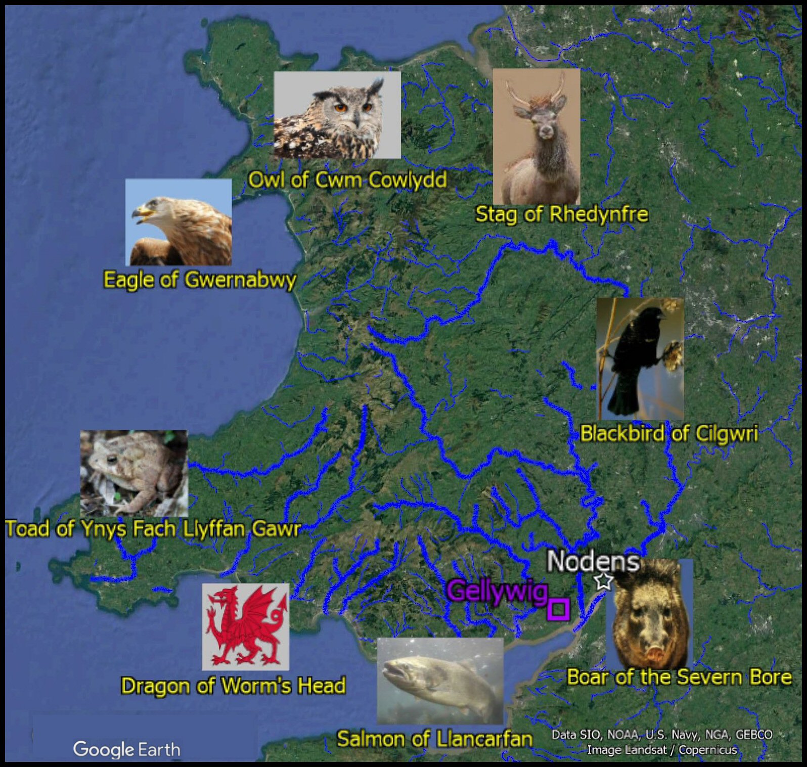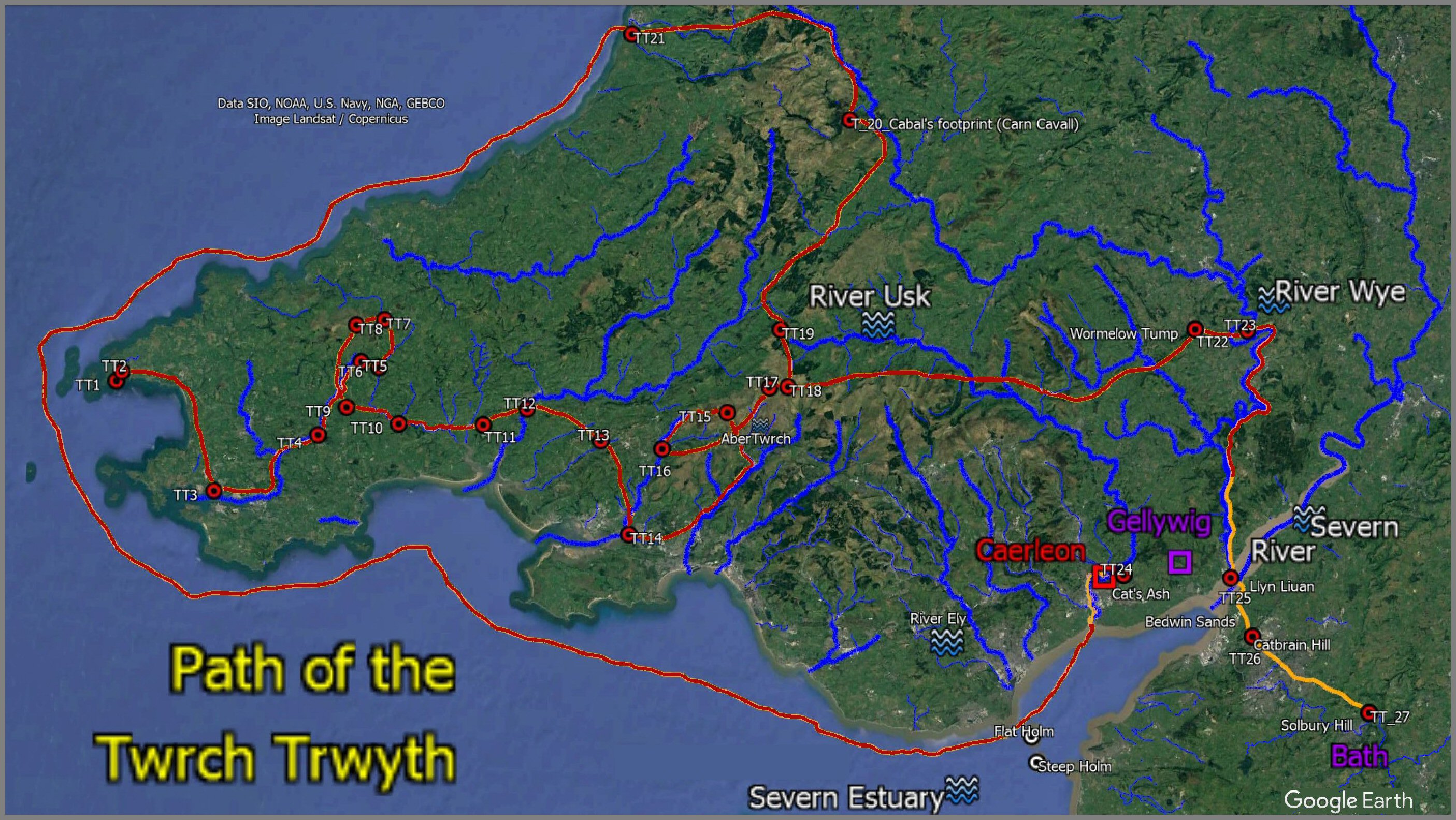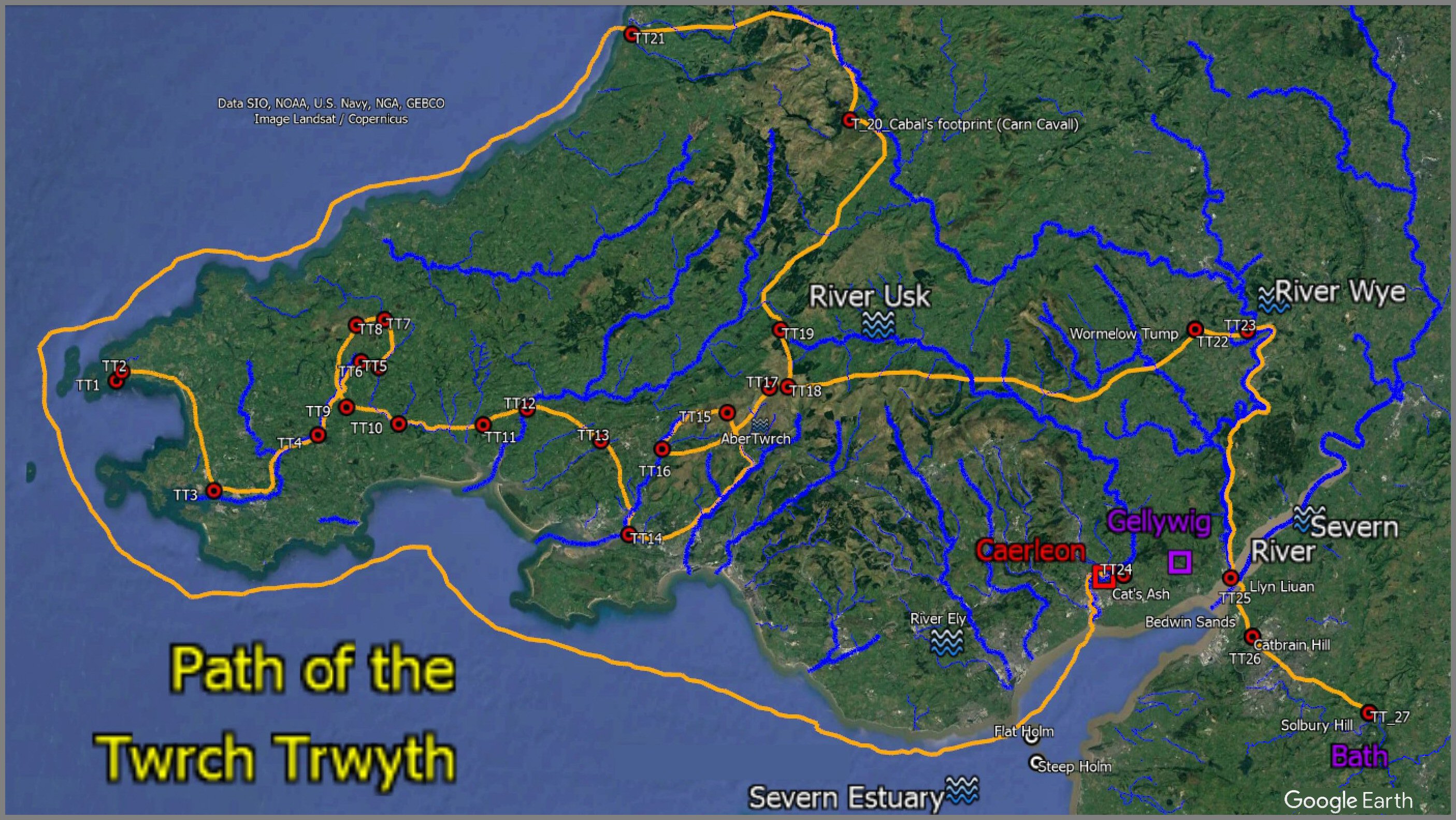 When Henry Tudor, having his descent from Welsh Kings, lands in Pembroke on the west coast of South Wales and marches through Central Wales to win the Battle of Bosworth to become King Henry VII of Britain, he would have passed the northern reach of the Severn River where the Battle of Camlann17.6 was fought. The River Severn then flows down the east side of Wales to the sea (which with the River Dee to the north, roughly outlines the country of Wales today) and, upon reaching the Severn Estuary in South Wales, it flows past the hillfort on the western shore that was once King Arthur's Camelot1.8 in Monmouth, next to Glamorgan (named after Morgan Hen, his descendant) with Arthur's birth-place in Pen Ychen2.2.--- Not England; not Tintagel, Cornwall; not Scotland; not France. 'Cymru yw'r Brenin Arthur'!; Wales is the true place of King Arthur!