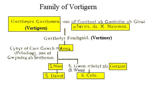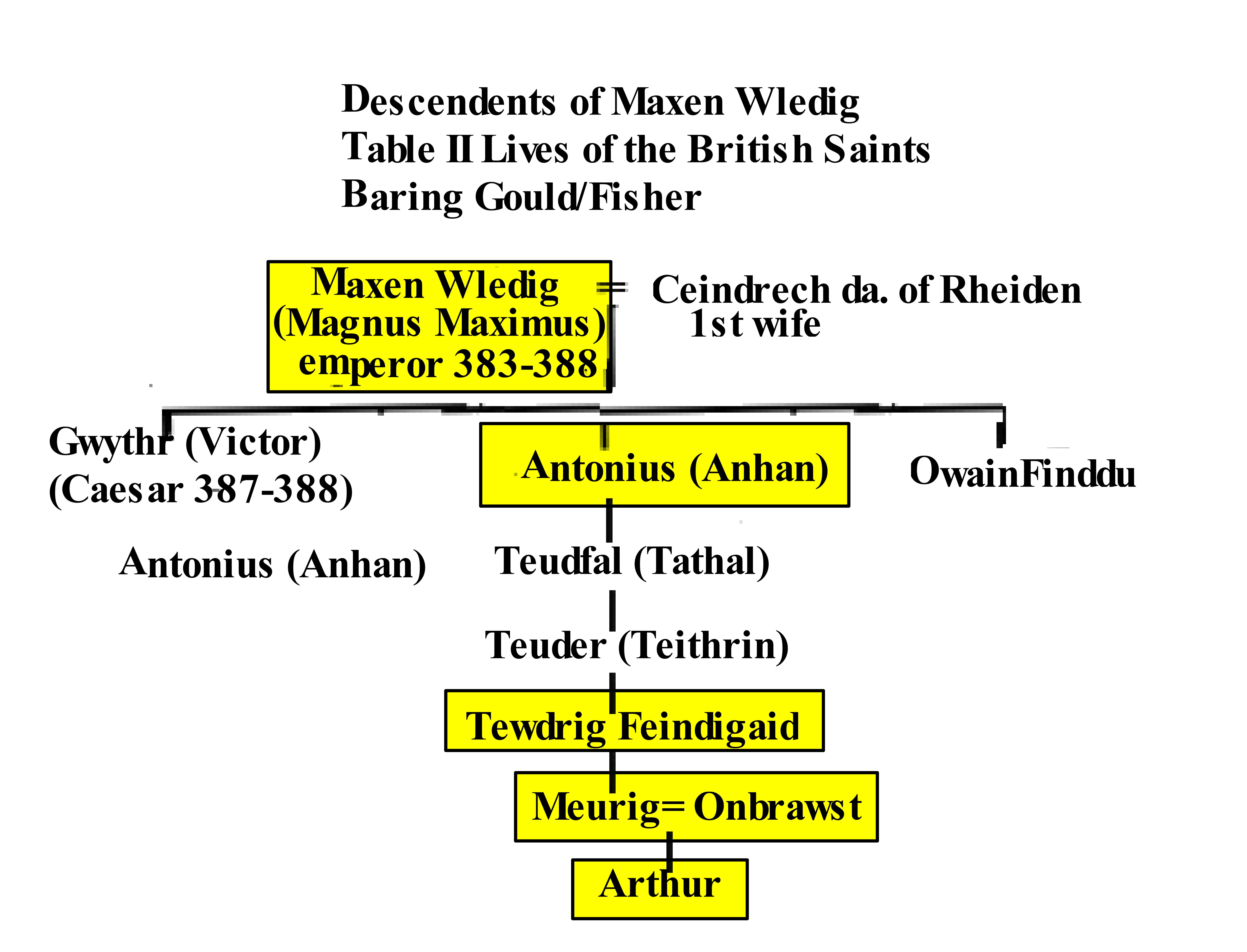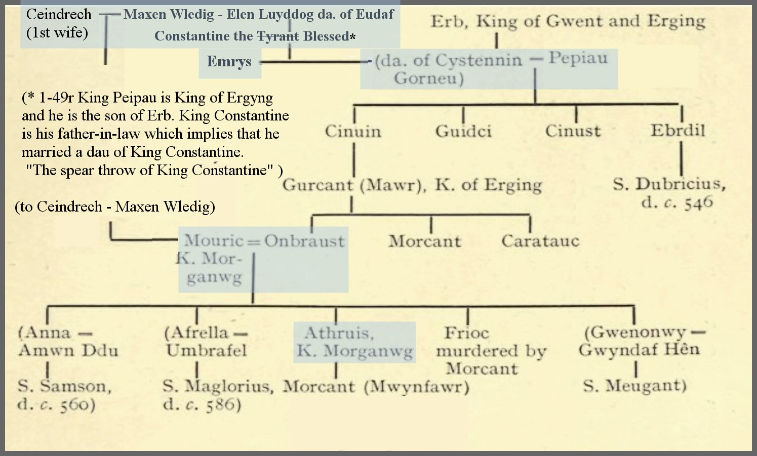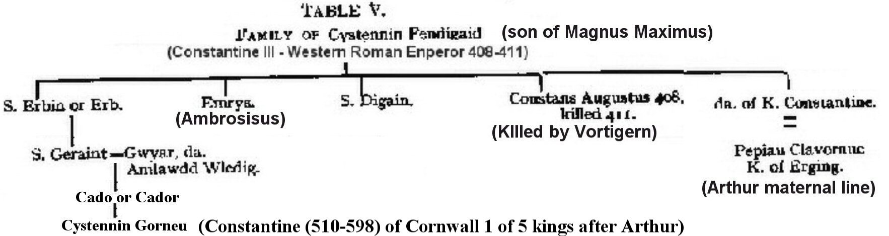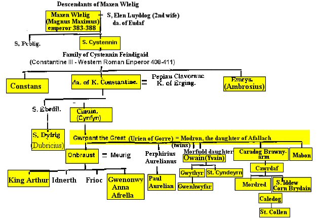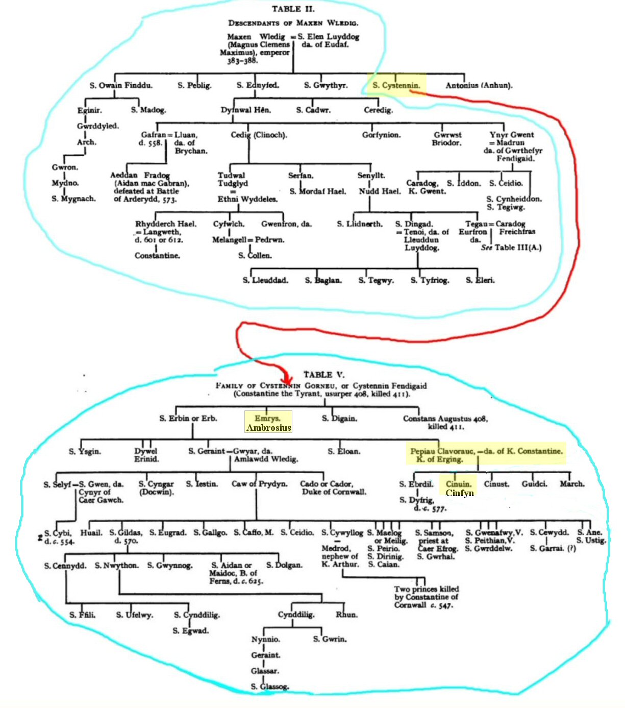 The above chart is obtained by connecting Table II and Table V by realizing that St. Cystennin the son of Maxen Wlelig in Table II is the same as Cystennin Fendigaid in Table V then connecting using Book of Llandaff