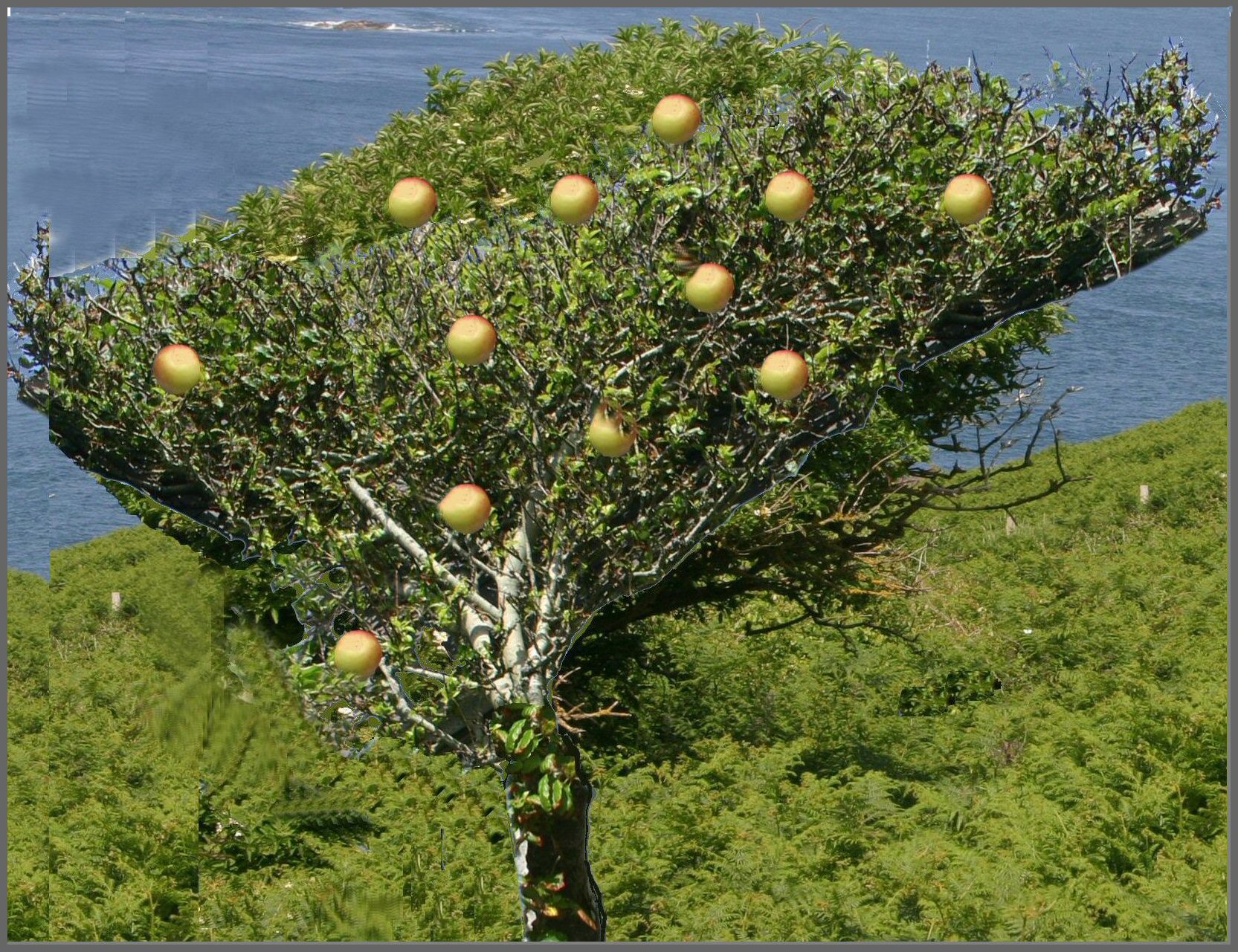 The sky has cleared and sunset has left in a rosy haze behind the hill. From an apple tree, Merlyn trims off some mistletoe with his silver sickle, saying, “It is fortuitous that this is the day of the full moon for only then does it have the proper potency.”