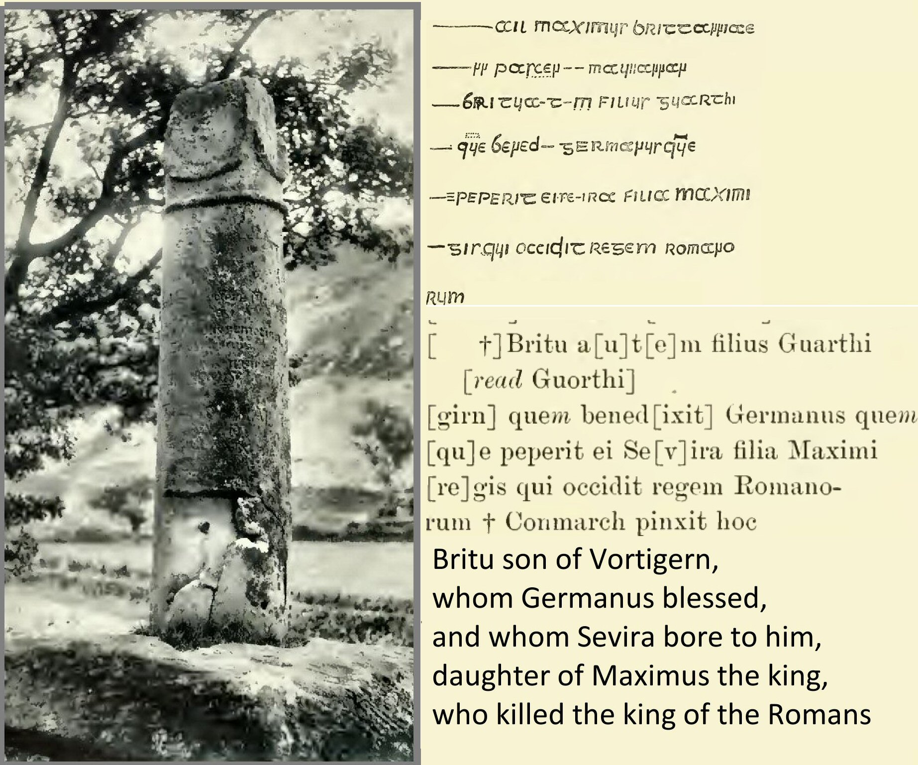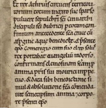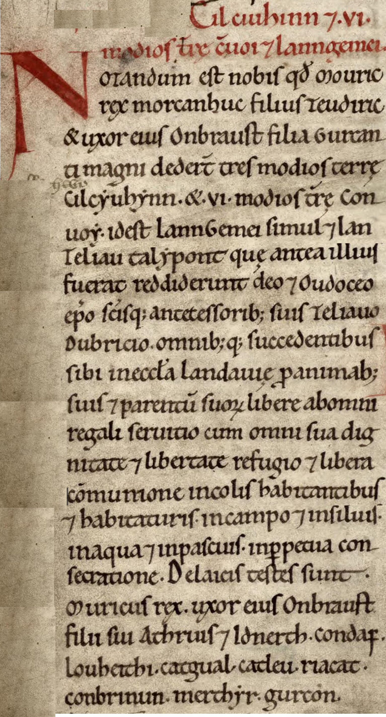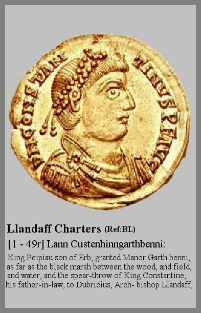 Athruis (King Arthur), King of the Guent (Gwent) region, granted to God and Saints Dubricius and Teliauus into the hands of Comeregius the Bishop, the Church of Cinfarch, the disciple of Dubricius (St. Cynfarch), with its appurtenant lands that is Manor Troumur and Lanndeui, Lann Junabui, and Lann Guoruoe in the field of Molochu and the mansion of Mafurn and Lann Calcuch and Lann Cerniu (Cernyw}, with all its appurtenant land to the exclusion of his heirs except by assent of the Bishops of Llandaff, and with all liberties and commons in plain and in woods, in water and in meadows forever.