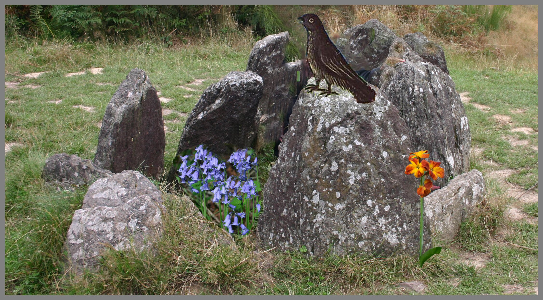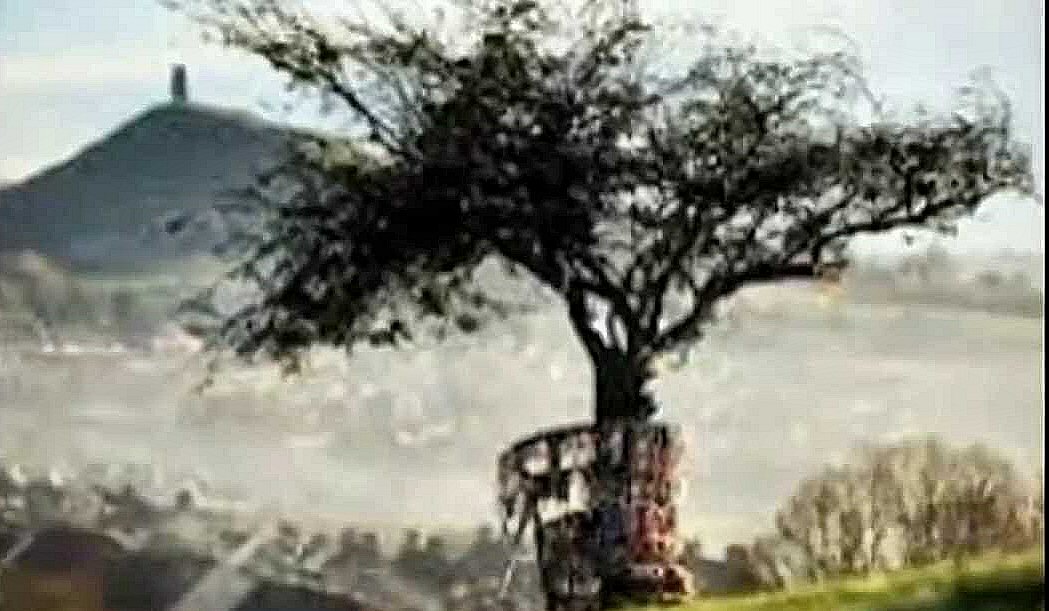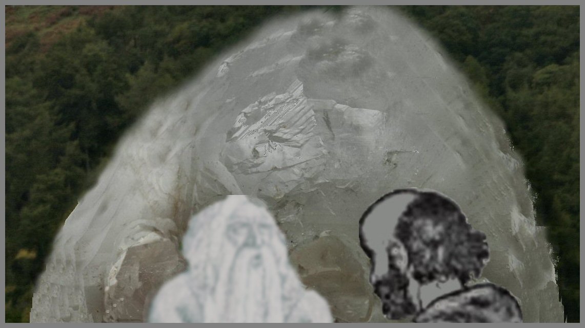 A shadowy figure, seeming to be dressed as a monk, can be seen through the raindrops standing outside a rocky hillside covered by grass. Suddenly a crystal doorway appears in front of him. This hill is called Bryn Myrddin or as the English say 'Merlin's Hill', located near Carmarthen town in Wales.