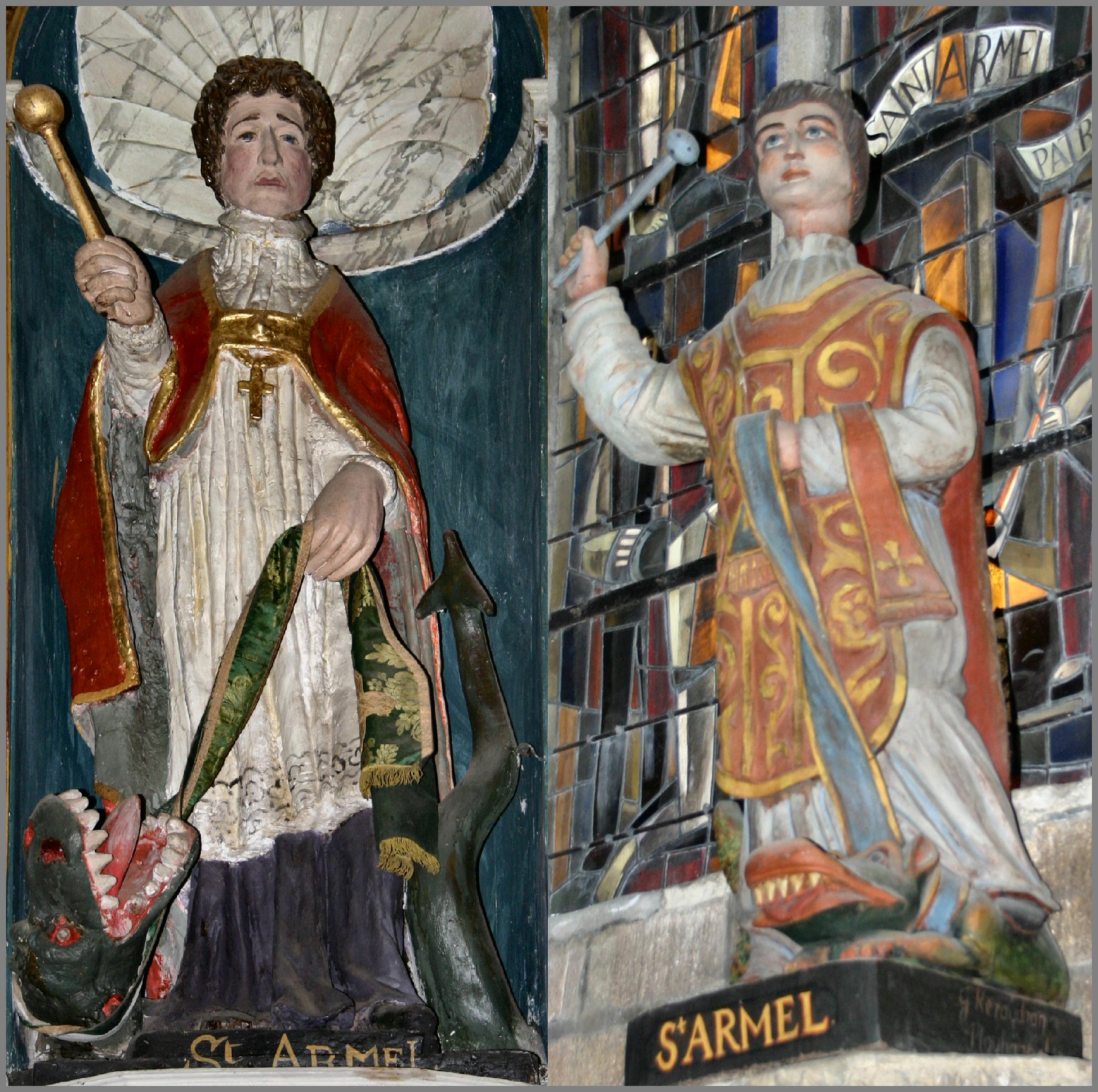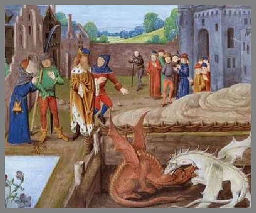 Arthur replies confidently, “Yes, Merlyn, I have witnessed you doing just that! But I also have been graced by the power of early Christianity; for I, as a lowly monk, was able to expel a real dragon while the townspeople of my Church of St. Armel looked on in awe. In fact, it is at this Church that my coffin can be found, of which only my jawbone remains.”