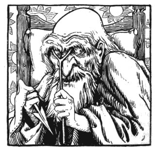 He embraces Merlyn, looking, as Arthur remembered him, with a long white beard and a raggedy purple cloak. His head is topped with a floppy, blue-pointed hat with a brim.