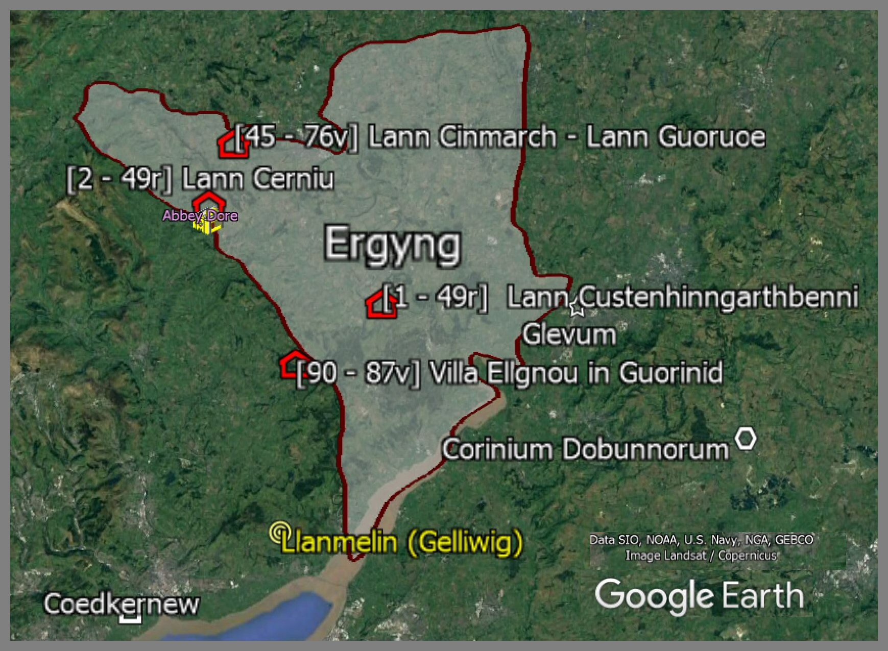 Boundaries: "The Manor of Tnoumur, from the fissure of the valley of Annwg on the Wye upwards along the valley to the ditch in the valley, following the ditch near the high road throughout its length to the Pool Merrick (a brook near Mathern, Monmouthshire site of Church: where Arthur's grandfather died, now named for Arthur's father Merrick). Upwards with Pool Merrick for a boundary to the Pant Mawr, along Nant Catguistil upwards to the Sow's track, to the Taran-bwll, to the ? -tog, to the mound of the Yew-tree, through the wood downwards to the dyke, along it to the Wye, with its wears downwards as far as Pant Annwg, where the boundary began."