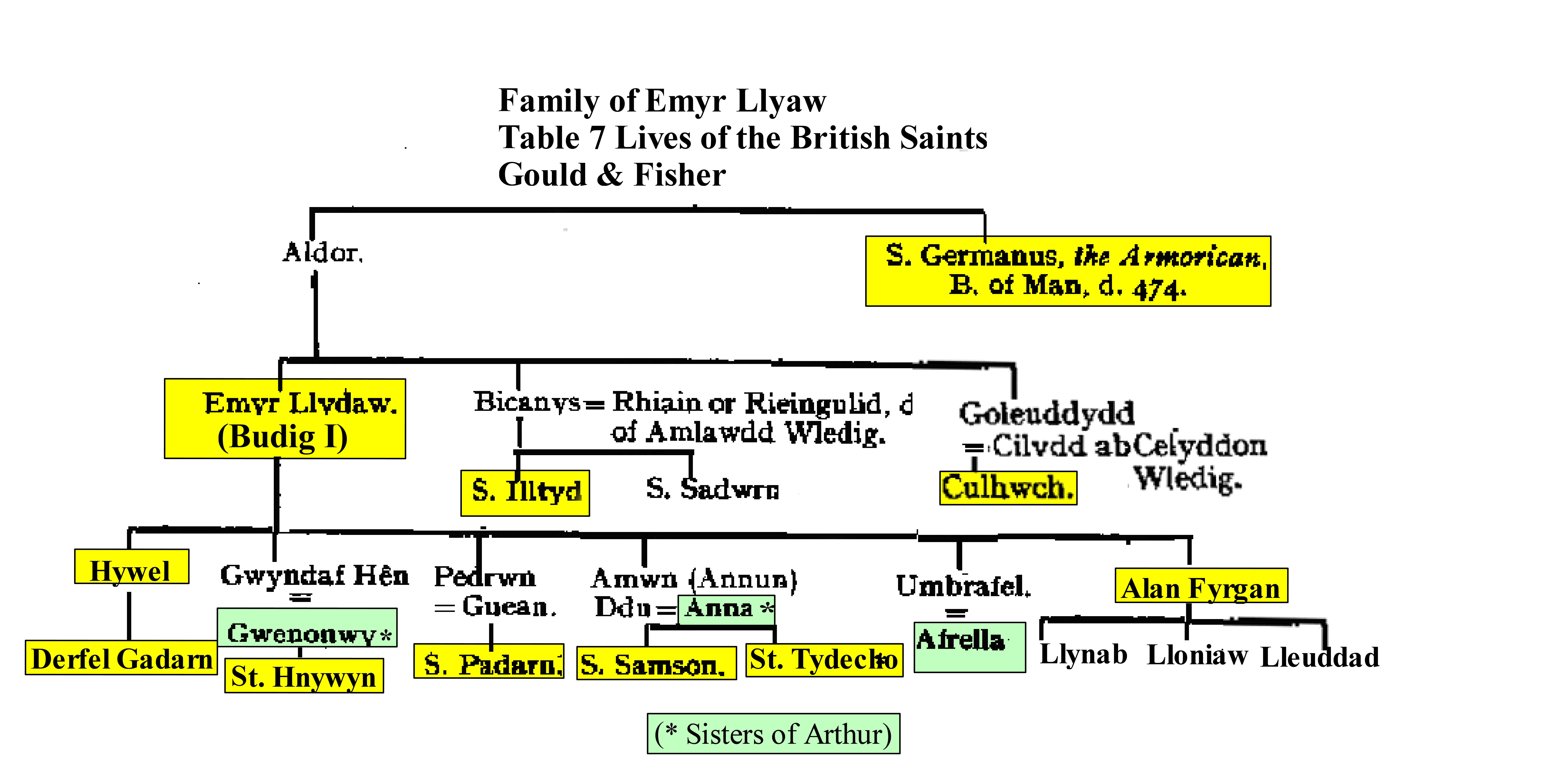 Due to the marriage of Arthur's three sisters Gwenonwy to Gwyndaf Hen, Anna to Amwn Ddu, and Afrella to Umbrafael to the sons of Emyr Lydaw, Emyr Lydaw (Budic, Emperor of Armorica (Brittany) was Arthur's uncle and his great uncle was St. Germanus of the Isle of Man (For more see BL), and his cousin was St. Illtud.