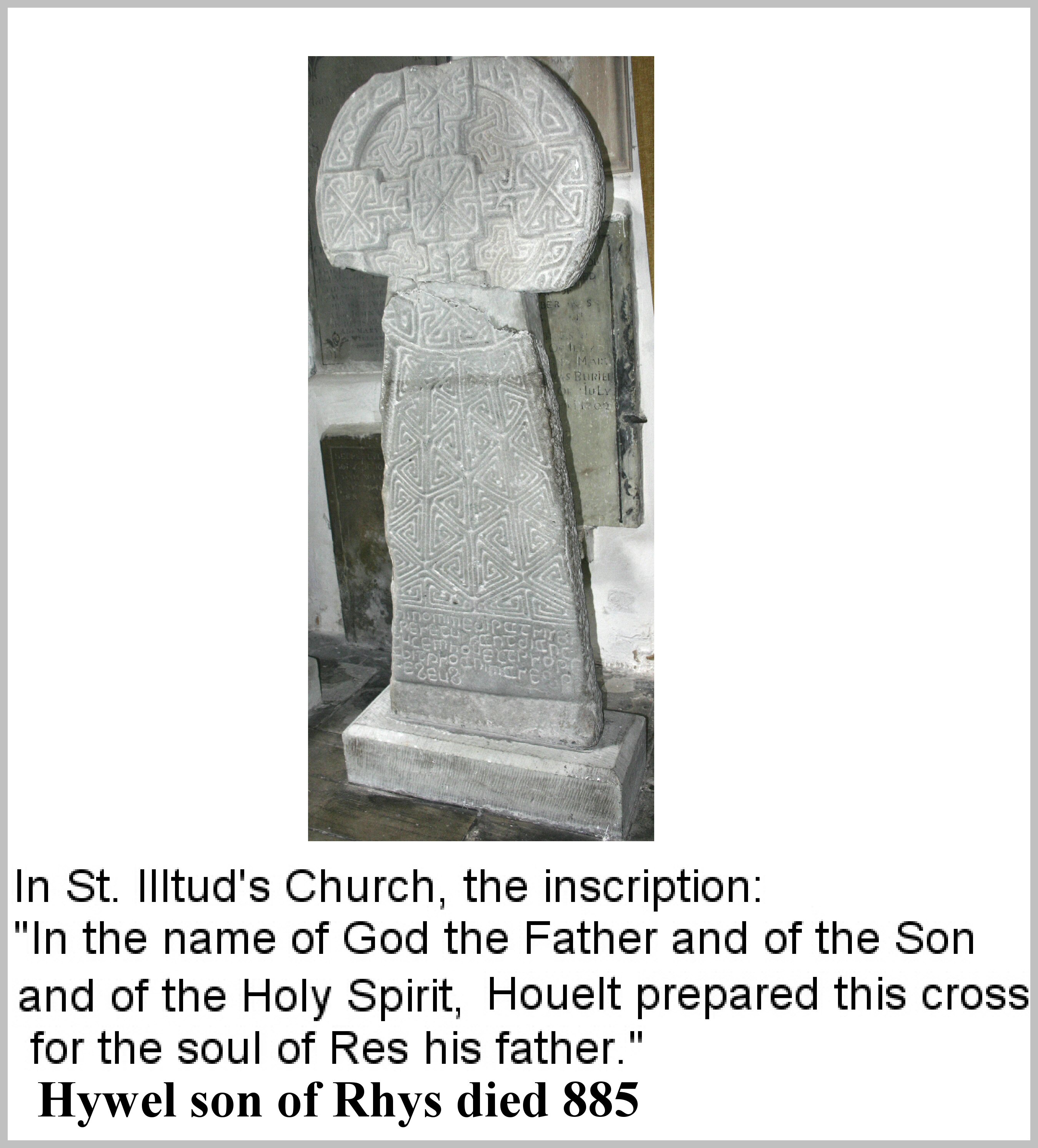 Bishop Ffili is the brother of Bishop Ufelwy, who is under Teilo in the Llandaff Charters. Both are said to be sons of Cenydd (Keneth) who is called crippled because he was born of incest and caste out by his father Deroc, the son of Rhiwal, prince in Brittany from South Wales. That their grandfather is Gildas is unlikely. The importance of this stone is that it confirms the existence of Arthur in Glamorgan and the validity of the Llandaff Charters that many scholars believe are bogus (For more see BL). The reference to Glywys is honorary as he founded Glywysing.