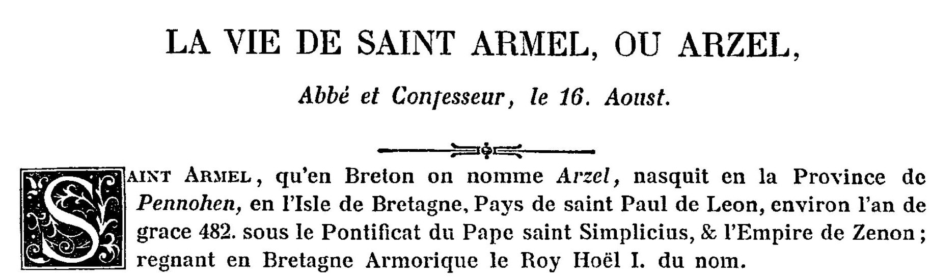 St. Armel: Albert Le Grande's Lives of Saints of Brittany (Les vies des saints de la Bretagne Armorique) (Guy-Alexis Lobineau), 1725