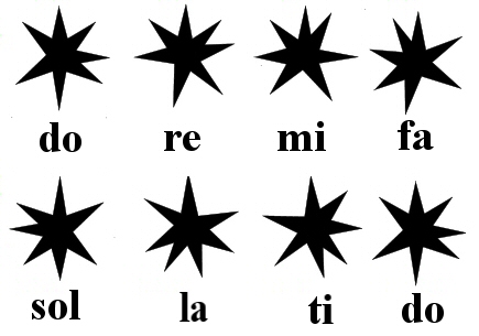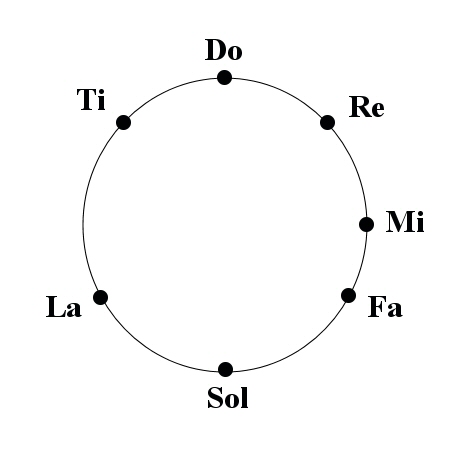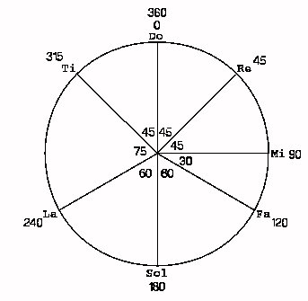 Dividing up the zodiac into seven parts as in the Gurdjieffian representation in the previous chapter but this time paying attention to the fact that the frequencies of the intervals 'do' to the next higher 'do' are not uniform. The intervals are as follows: 'do' - 're' is 1/8, 'do' to 'mi' is 1/4, 'do' to 'fa' is 1/3, 'do' to 'sol' is 1/2, 'do' to 'fa' is 2/3, 'do' to 'ti' is 7/8, and 'do' to higher 'do' is 1. By multiplying these ratios by 360 degrees in a circle yields: 45, 90, 120, 180, 240, 315, 360 for 'do', 're', 'mi', 'fa', 'sol', 'la', 'ti', higher 'do'. This results in a more accurate representation of the intervals of an octave within a circle as follows: