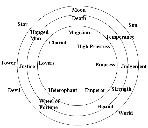 The seven divisions work well, but for the planets and cusps they are too few to be useful. It would be logical to subdivide each of the seven sections into three parts giving twenty-one as in the Tarot cards (the Fool is merely zero so is not counted in the major arcana total), but this is too many. Consequently taking into account the astrological principle that the later part of a sign begins to take on the aspects of the next sign, it was logical to use the last third of each of the seven sections as a new sign having qualities mainly of the section of seven that it is in, but beginning to have qualities of the next. This gives seven major signs and seven lesser signs for a total of fourteen possible signs.