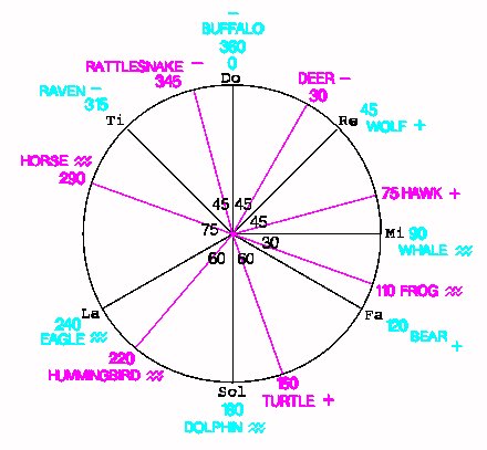 The signs being Native American can also be placed on a medicine wheel. The medicine wheel is a sacred circle drawn on the ground with the four directions: north, south, east, and west being aligned to true north, south, east, and west. In addition, to these four directions, are added by some, three other positions termed above, below, and within. This makes seven positions and matches well with this seven-position system. Traditionally, and also here, Buffalo is north, Wolf is south, Eagle is east, and Bear is west. The rest of the positions are not established by tradition. Here the Dolphin was chosen to be above, the Whale below, and the Raven within. The dolphin was chosen for above because of its affinity with angels, the whale obviously is the ruler of the deep, and the raven holds a special importance to all Native American cultures somewhat like the coyote, but being black it has no vanity and it is in closer contact with the Great Spirit that must be first found within.