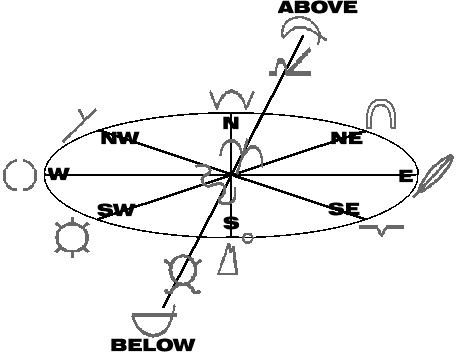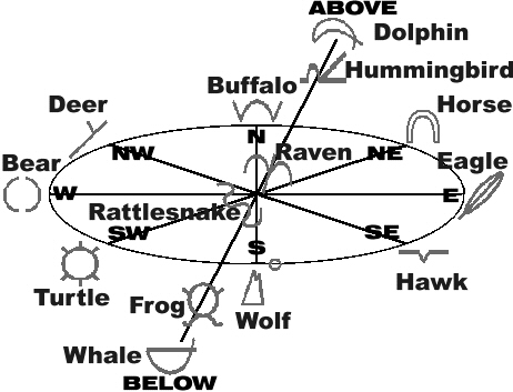 With Wolf figured out, Tarot could recognize Bear in the west showing its ears as in the sign language symbol, Buffalo in the north with its sign language horns, and Eagle in the east as a feather. Tarot had studied under a Native American medicine man one summer and knew the four directions. He also knew that the Raven was the center of all things with the Rattlesnake being its similar power. He saw Dolphin and Hummingbird above, Whale and Frog below, Turtle in the southwest, Deer in the northwest, Horse in northeast, and Hawk as southeast. It all made perfect sense and this time it seemed from the medicine man's gestures to be not just a medicine wheel, but somehow a whole new astrological system. (See Appendix B)