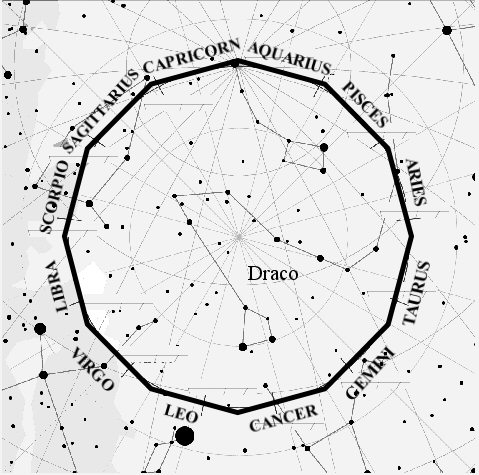 The precessional circle can also be divided into twelve astrological signs like the yearly zodiac where each sign of the zodiac is thirty degrees of a circle corresponding to the astrological months of the earth year. (Although there are ~365.25 days in year and when divided by 12 months equals 360 days with ~5.25 days left over, the astrological precessional circle is considered to be exactly 360 degrees, thus when divided by 12 equals twelve 30 degree segments of 30+ days.)