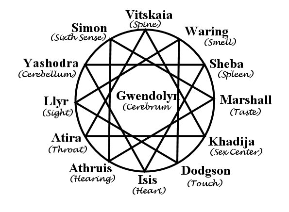 Each of the six sisters and brothers in the circle around them began to glow in the color of the planets that ruled them: Vitskaia like the Moon, Sheba and Llyr like Mars, Khadija and Marshall like Saturn and Athruis like Uranus, Dodgson like Neptune, Isis and Simon like Venus, Atira and Waring like Mercury, and Yashodra like Jupiter.