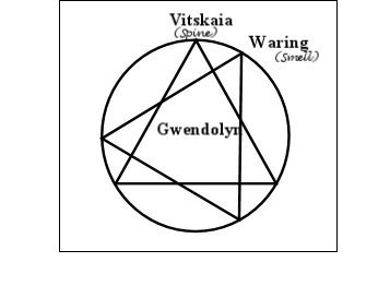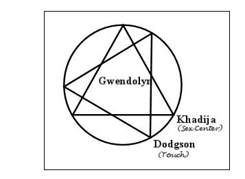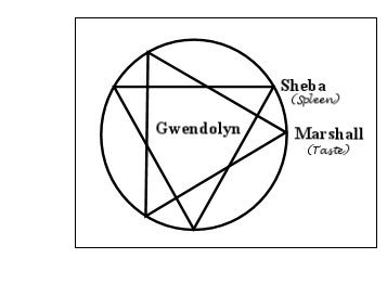 Gwendolyn moves to her right to the top point of the clockwise triangle to stand in front of Waring, saying: