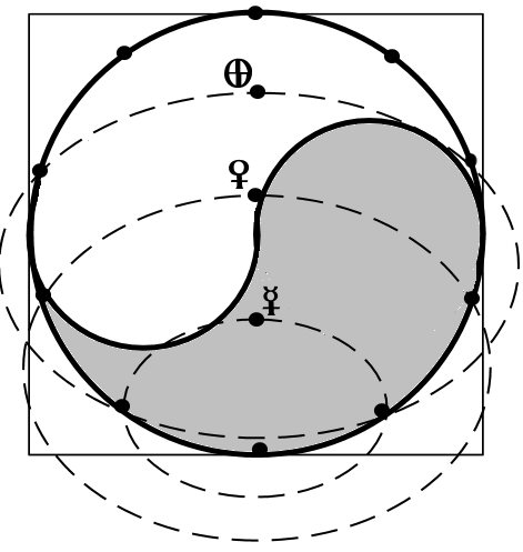 One of the pentacle's significant qualities is that when placed inside a circle, it will divide that circle into five equal arcs each of seventy-two degrees. This value of seventy-two is a useful value to define the average lifetime of years in the family unit of daughter-mother-grandmother. It is then possible to obtain the approximate length of the complete precessional cycle by multiplying this number seventy-two by the number of degrees in a circle (360). The result is a value of 25,950 terrestrial years that gives the compete precession cycle from beginning to end.