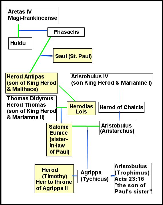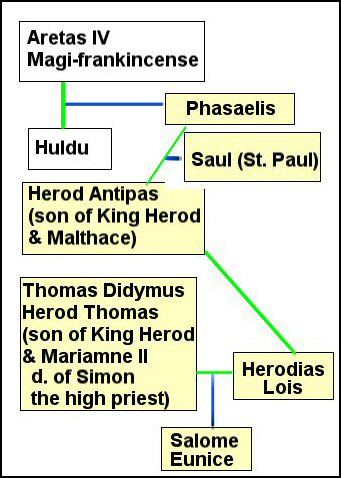 Also, it will be shown how St. Paul could be both a Roman and a Jew since his father was Herod Antipas, an honorary Jew, and his mother was the daughter of the Magi King of Petra at Jesus' birth, known for frankincense and myrrh. The alliance of Paul to Jesus was accomplished by the marriage of Jesus' daughter Phoebe to Paul yielding two granddaughters, the oldest named Paulina.